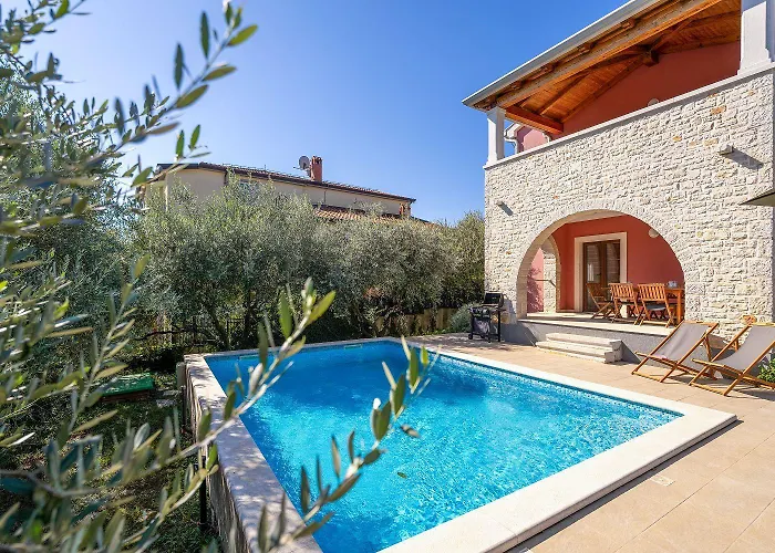 Idyllische Villa Mit Panorama Meerblick, Privatpool, Babybett, Aussendusche, Umgeben Von Oleander Und Oliven med 2 sovrum, som ligger cirka 10 minuters bilfärd från Aquapark Aquacolors Poreč, har en pool som garanterar en avkopplande vistelse. Gästerna kan delta i snorkling, dykning och vandring i den här villan, som ligger cirka 10 minuters bilresa från Decumanus ulica.